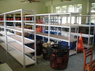 青山國小體育器材室訂製的免螺絲角鋼架.用來放置學生的體育教材用品依照器材用品的體積可做調整.方便歸類清點.專人丈量估價.代施工